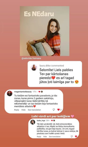 Man tik ļoti noderēja Šelomītes palīdzība! Bija vieta, ko savā mājā nemācēju uzturēt kārtībā un tā bija kļuvusi par tādu budzi priekš manis. Process bija intensīvs, bet rezultāts ir paliekošs un vairs nav nesapratne KĀ?! Bet miers un skaidrība, kas noder arī visās citās zonās! Iesaku!