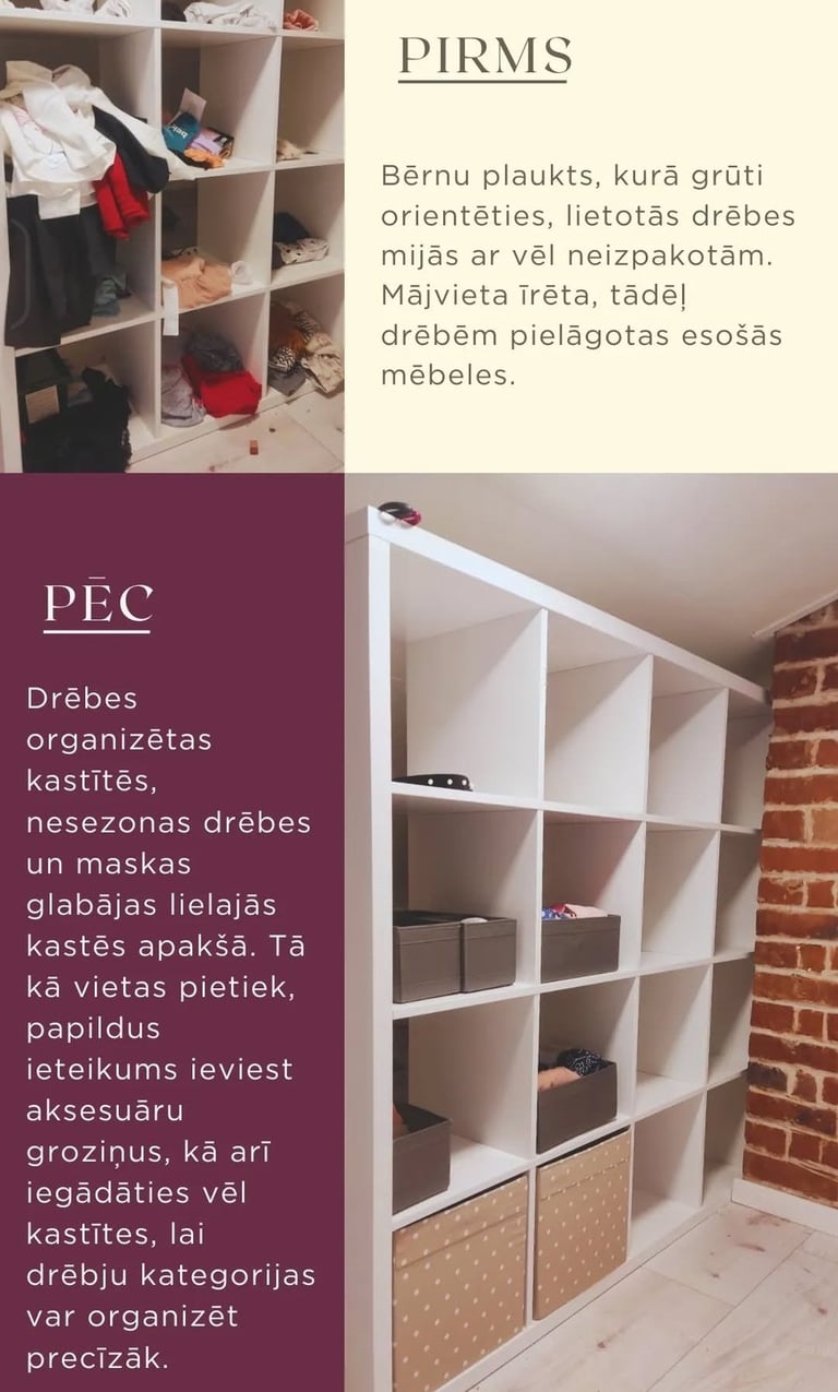 ”Šelomīte patiesi mani iedvesmoja. Viņas klātbūtne ļāva kritiskāk paskatīties uz visu to, kas man ir un kas no tā vispār ir nepieciešams, kas lieks un kas man nemaz nepatīk un nesagādā prieku. Mēs kopīgi nolēmām pamainīt dažu lietu atrašanās vietas virtuvē, saorganizējām lietas pa grupām. Virtuve ir sakārtota, pārskatāmāk visas lietas. Sapratu, ko nepieciešams vēl iegādāties, lai vieglāk būtu organizēt lietas par grupām (kastītes kādas un cik daudz).”